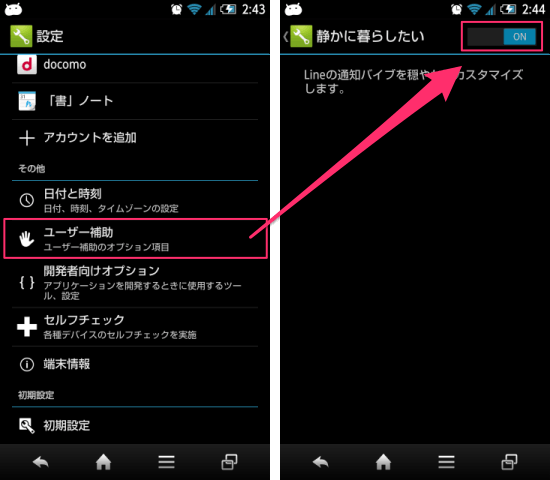 スマホ本体の設定内にある「ユーザー補助」という項目を探しましょう。「ユーザー補助」をタップしたら『静かに暮らしたい』の機能をオンにします。これで事前準備は完了。