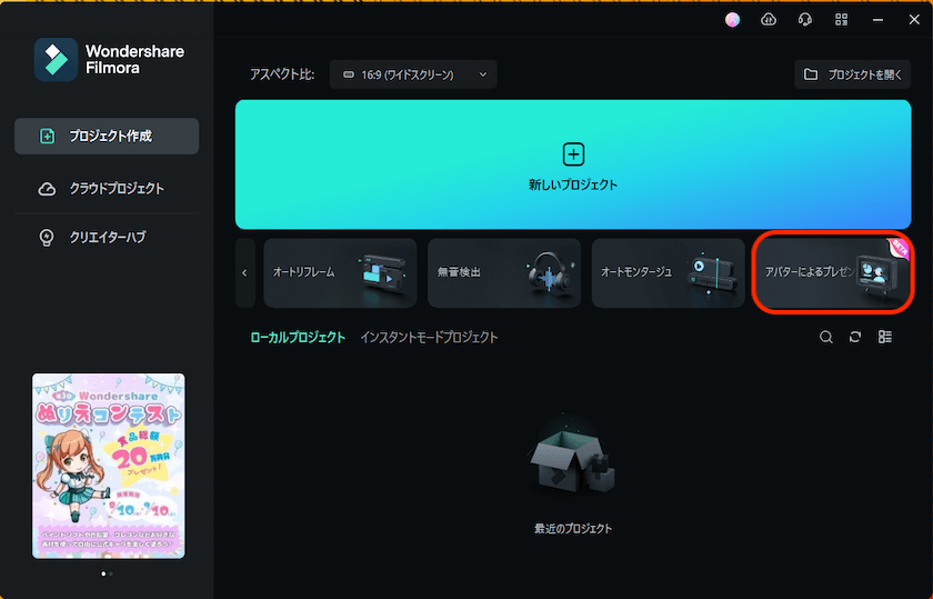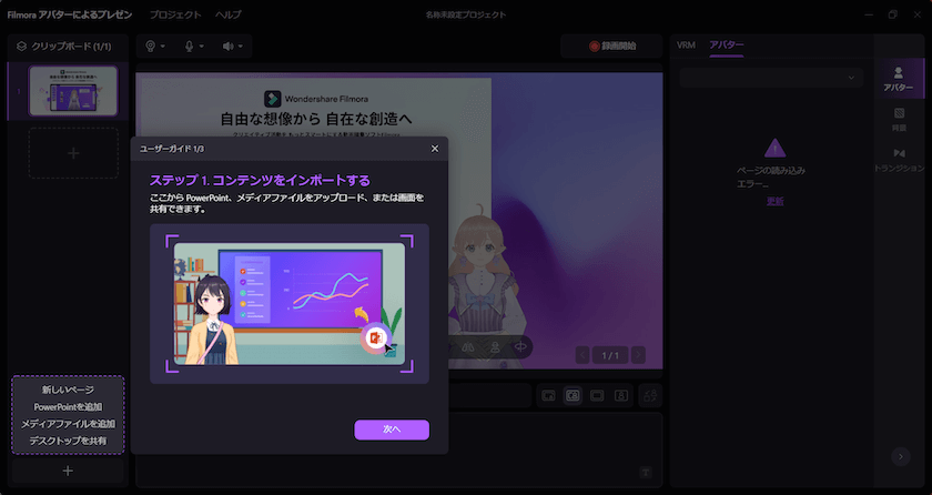 『Filmora』にはこのほか「アバターによるプレゼン」という機能が搭載されています。まだベータ版ということもあり、今後どうなるかはわかりませんが、これも面白い機能の1つです。