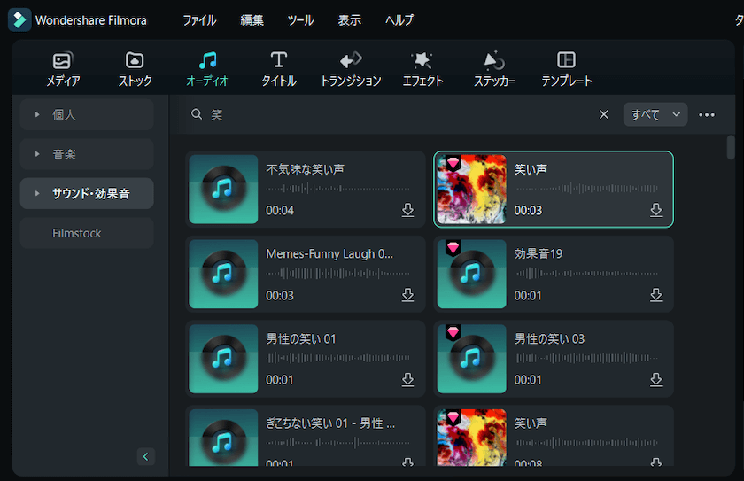 キーワード検索も非常に有効です。例えば外野からの笑い声を動画に入れ込みたいときは、[オーディオ]→検索窓に「笑」と入力すれば簡単に見つけ出すことができます。