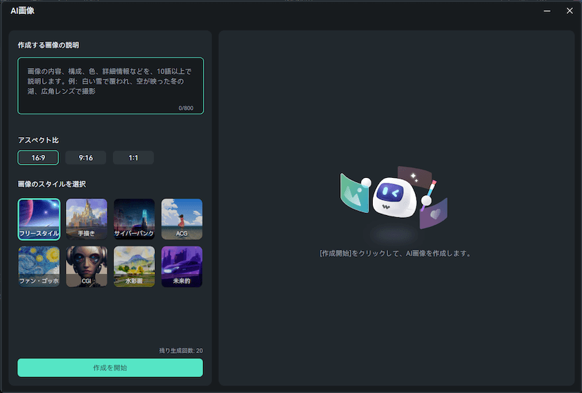 面白いなと思った機能の1つがこれ。「AI画像」という機能です。10語以上の説明文を入力してアスペクト比や画像スタイルを指定して[作成を開始]をクリックするだけで、AI画像をあっという間に生成してくれます。